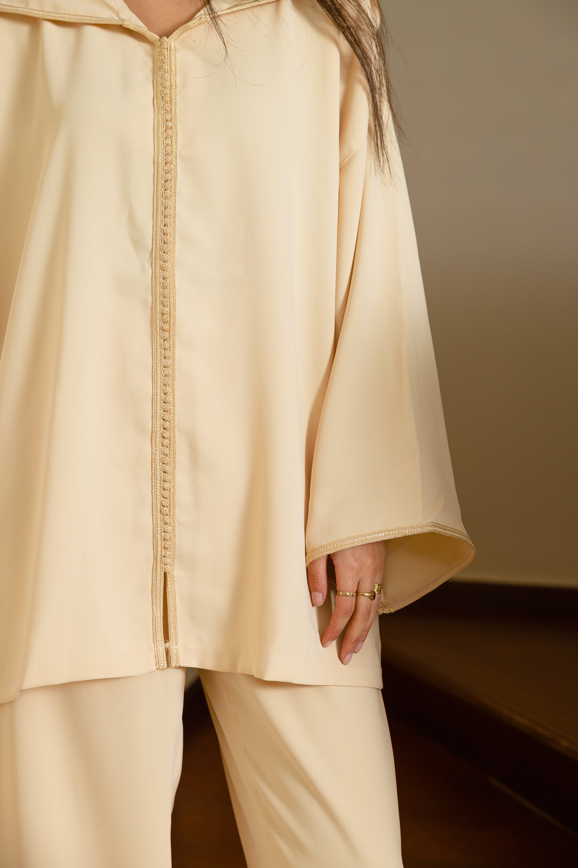 - La coupe du chemisier est oversize avec une capuche, il dispose de 3aqad et sfifa tout le long devant et d’une sfifa également sur les manches.